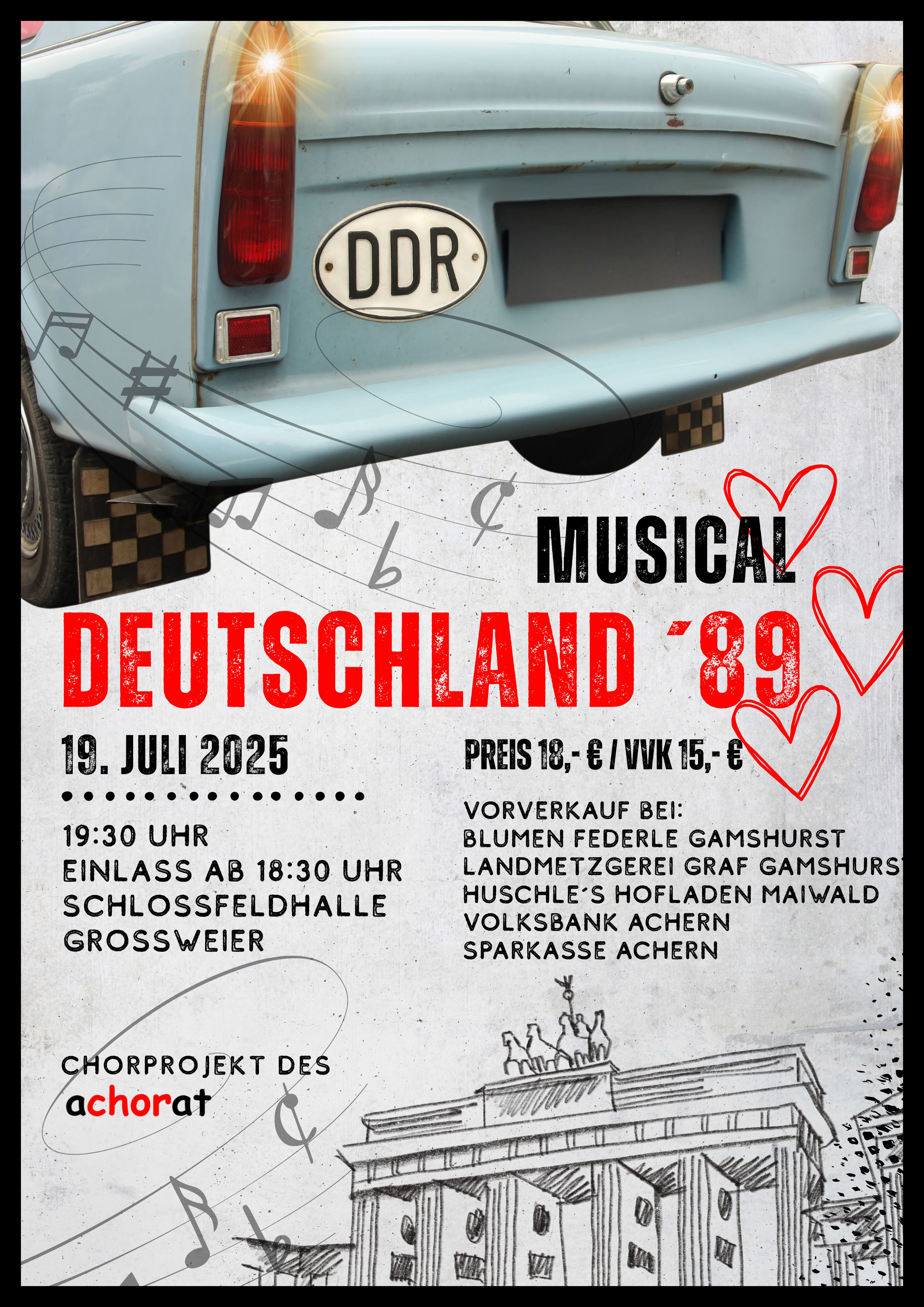 Unser Musical „Deutschland 89´“ wurde in der Schlossfeldhalle in Großweier aufgeführt. Wir erhielten überwältigendes Feedback und bedanken uns bei allen Zuschauenden.